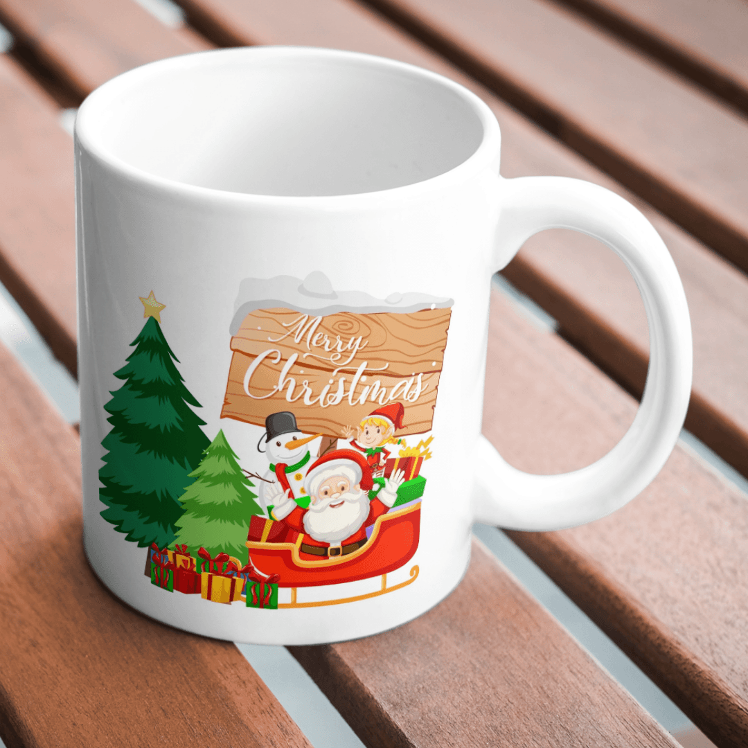 December 11, 2025Santa rides festive sleigh with gifts beside Christmas trees and snowman